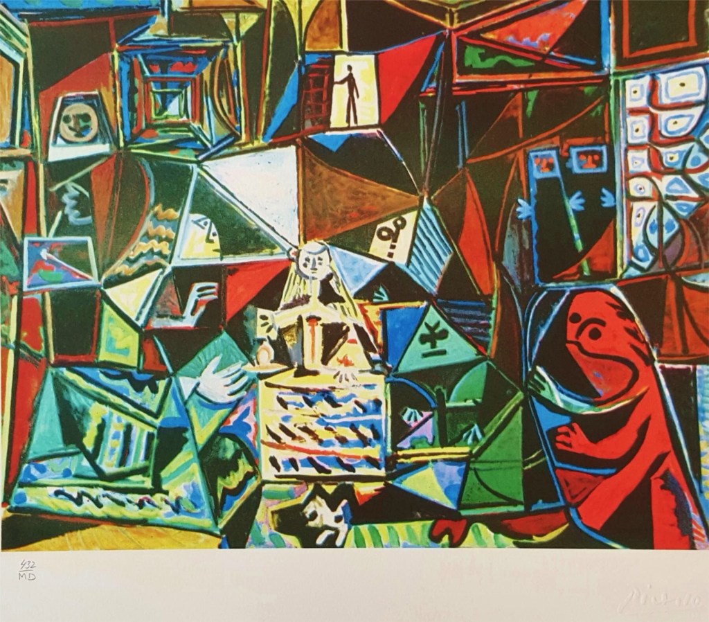 Picasso painted dozens of Meninas derivative pictures like this one – with many of the same components – like girl in dress, dog laying down, man coming in through door in back: