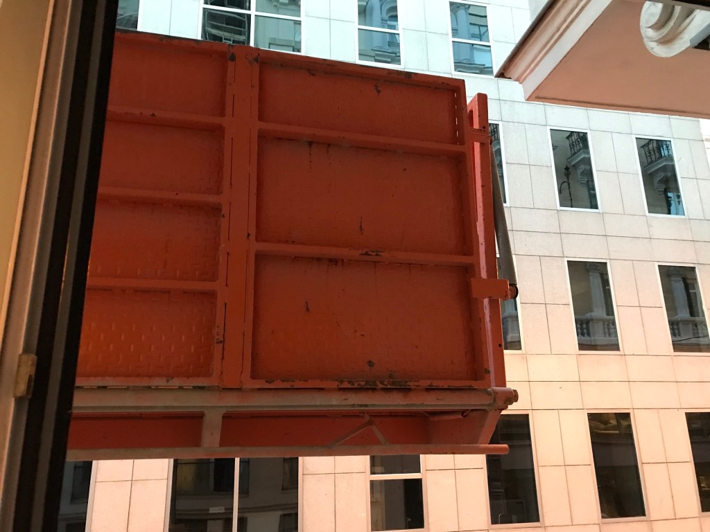 Even better, directly attached to my exterior window is this. It’s a construction/freight elevator and so, during working hours, random men ride this elevator past my hotel room window.