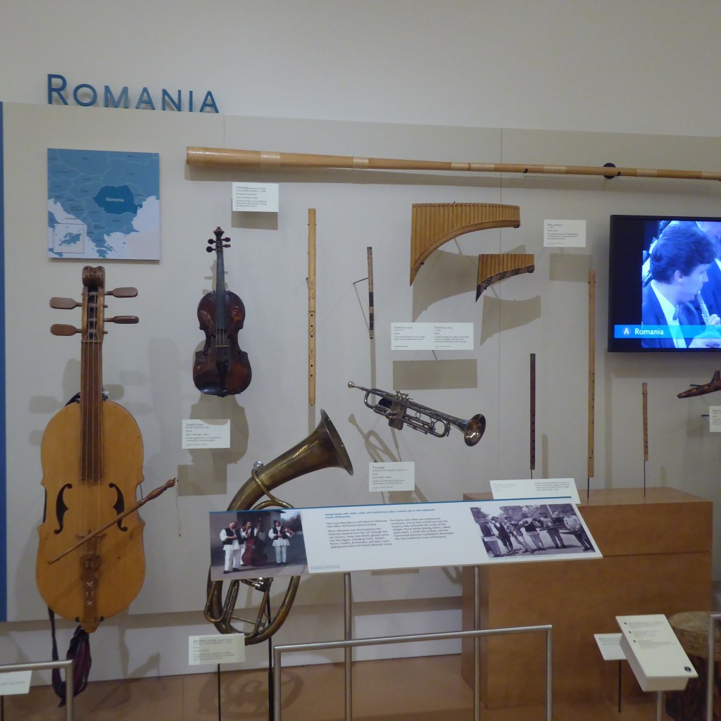 The building flows out in various hallways. One hallway is Asia, another is Europe etc. And once you’re in a hall, you find single displays for each country, along with a few clothing items, a bit of cultural information, and a bunch of instruments. Each display also has a video loop of citizens playing some of the weirder instruments. Here’s a board for Romania and then Turkey: